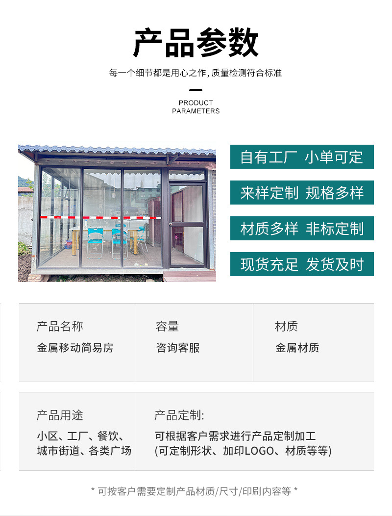 移動簡易房批發(fā) 可拆卸材料便攜活動版房 戶外活動防水組裝屋子適用于小區(qū)、工廠、餐飲、城市街道、各類廣場、企業(yè)單位、花園、公園、學(xué)校、碼頭、風(fēng)景旅游區(qū)等公共場所,可按客戶的需要定投產(chǎn)品尺寸、材質(zhì)和印刷內(nèi)容